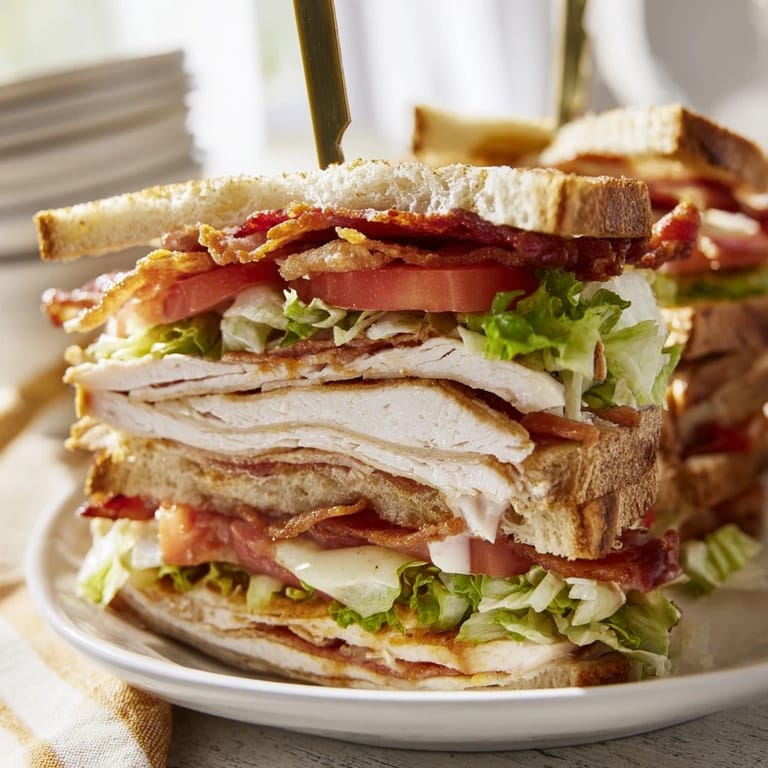 Pin It The smell of bacon sizzling in the kitchen always stops me in my tracks. I first started making these towering club sandwiches during college when I needed something substantial between classes. There is something deeply satisfying about building a sandwich that actually requires two hands to eat. My roommate would watch in awe as I stacked layer after layer, wondering if it might topple over before the first bite.